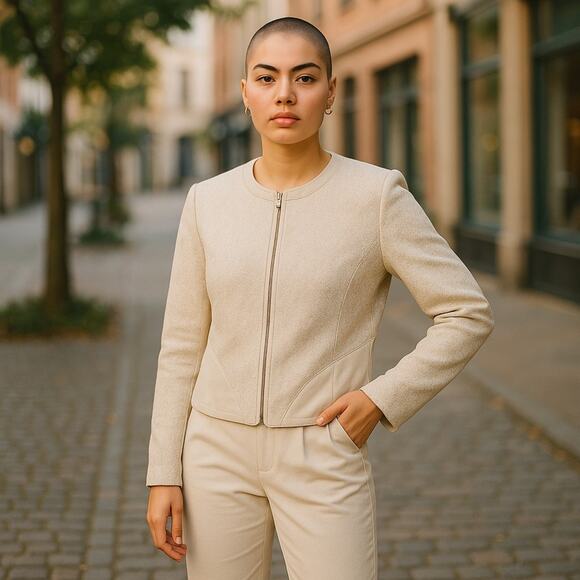 Lafayette 148 New York Women's Zip Blazer Cream Tweed Jacket Leather Trim Size 8