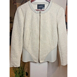 Lafayette 148 New York Women's Zip Blazer Cream Tweed Jacket Leather Trim Size 8