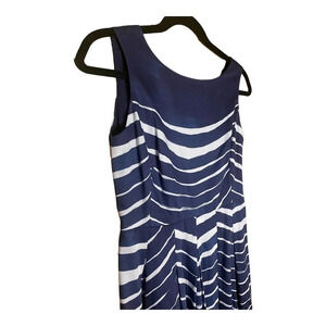 Hey there! I have a Lafayette 148 New York Zoe Sleeveless Poplin Dress in a size 2 that I think you might be interested in. This dress is absolutely stunning, with a navy and white design featuring flowing draped and bending stripes, with a touch of green toward the bottom. It has a bateau neckline and a flattering v-back, with wide shoulder straps adding a touch of elegance. The bodice has princess seams and a pleated waist, creating a lovely A-line silhouette.