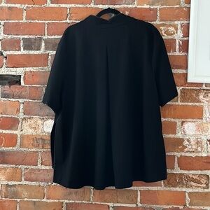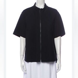 Lafayette 148 New York black short-sleeved collarless jacket, size XXL (equivalent to a U.S. 24). In excellent pre-owned condition, this short-sleeved kimono-style jacket has a zip closure and is made of heavier weight viscose-blend fabric with plenty of stretch. Has a cool collarless neckline and side slits. A great item for day-to-night transition, great for the office and for layering over a more casual outfit. A little wear on the leather wrapping on the hems, shown in photos.