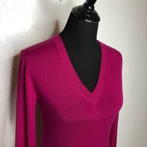 Lafayette 148 dark pink v neck wool sweater. Pullover style with v neckline. Ribbed hemline and sleeve cuffs. Sleeve cuffs were originally folded and stitched but stitching has come undone. Size Small. Excellent preowned condition. Minor wash wear. One tiny spot on back hemline.