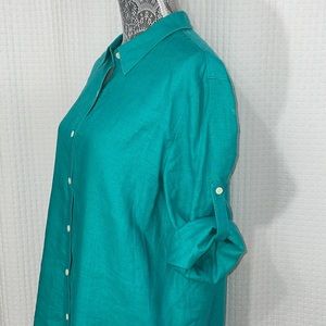 Lafayette 148 New York women's Size 10 teal green linen button up shirt.