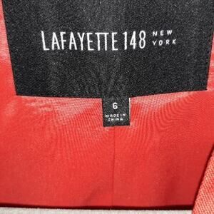 One button, fitted,, linen blend jacket with pockets. Like new. Pockets are still stitched shut. Color is a pretty orange red, and there are 3 decorative buttons on the cuffs.