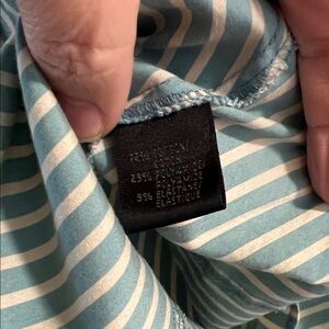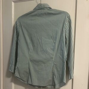 Robins egg blue and cream striped stretchy button up with 3/4 sleeves. Marked size 8. No flaws noted. Perfect for spring.