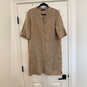 Lafayette 148 Shirt Dress Button Front 100% Linen Short Sleeve Tan Brown Large