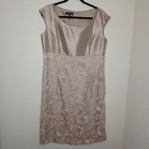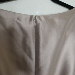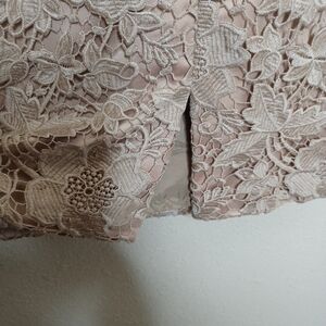 Top part has a metallic sheen. Bottom part has a top layer that's crocheted in a floral pattern. Small slit at the bottom of the back. Zips part way up the back.