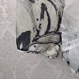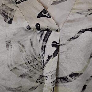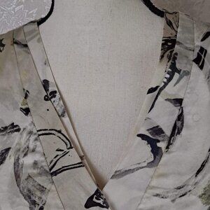 This 100% silk blouse features long sleeves , a double layer v-neck and a rounded hem. The pattern is an abstract floral in gray and black on a cream background. A lovely neutral. Classic paired with trousers or skirts.