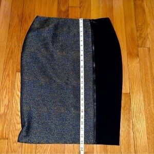 Gorgeous skirt with black panel zipper detail. Print is black, blue, and yellow/green specked. In excellent condition, no known flaws.