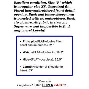 Excellent condition. Size "P" which is a regular size XS. Oversized fit. Floral lace/embroidered front detail overlay. Back and lower sleeve area is paneled with no embroidery. Back zip closure. All fabric is stretchy. Super rare and impossible to find anywhere! Lovely!