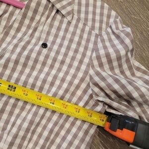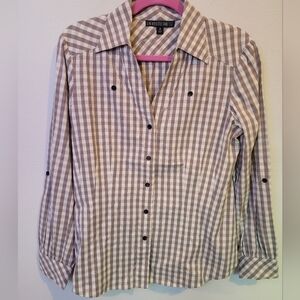 Lafayette 148 Taupe and Cream Plaid Gingham Button Down Blouse size 10