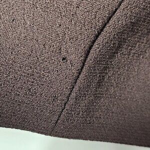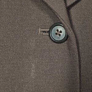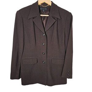 This Lafayette 148 blazer in chocolate brown offers a tailored fit with shoulder pads. The structured design and classic silhouette make it suitable for professional settings.