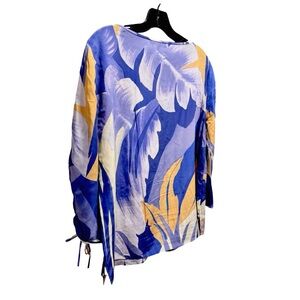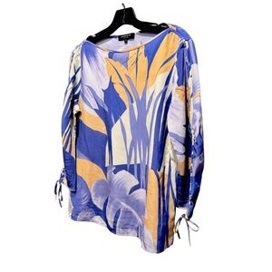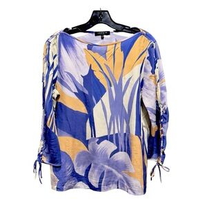 This 100% silk top, in a tropical floral print, has sleeves with unique ties at each end.