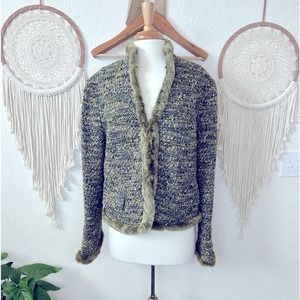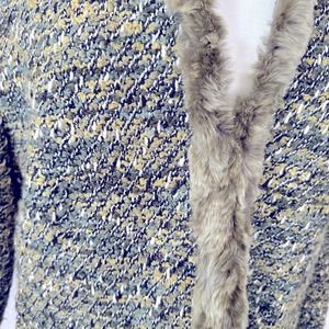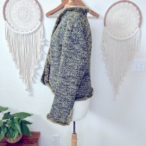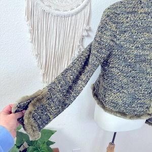 Lafayette 148 green tweed wool blend fur detail hook and eye closure cardigan sweater size 16