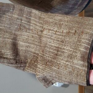 no fabric content tag no other condition issues feels like a linen blend tan blazer with neat stitch detailing and gold threads sparkling throughout size 10 by Lafayette 148 new york