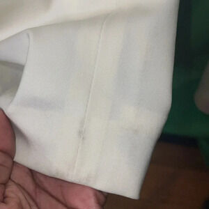 New with tags men’s Lafayette 148 pants size 22. These are cream color new with tags once again. I don’t see any stains besides two small ones on the bottom of each legs see photo looks like a floor stain. Should come out with dry cleaning. small hole where one of the tags were, not noticeable see photo.