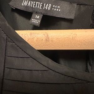 Like-new classic with a twist! Lafayette 148, size 14, silk, women’s scoop-necked, black SILK tuxedo shirt with slightly capped sleeve, twisted horizontal pin tucking mid front, and high-low hem. Sits at waits, slightly longer in rear. Hidden back zipper. 100% silk. One owner, non-smoking home.