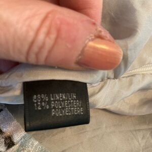 Really beautiful colors muted sea green, thistle pink w/dark chocolate black on off white background. Lining solid color shown like pale cocoa. Mint pristine condition like new. I removed inner straps to hang because they always seemed to pop out. Trumpet cut means almost like mermaid but shorter. Fitted then gently flares. Wish I could fit into this. Waist is 14” hips are 18” flat and top to bottom 27”. Very chic city vibe.