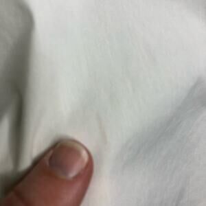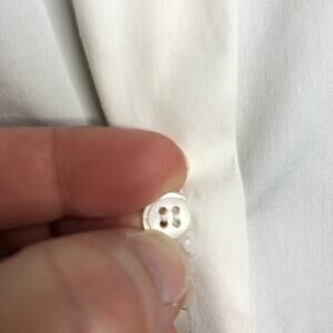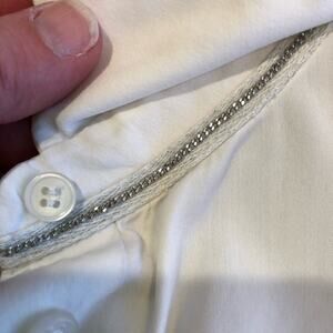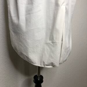 Lafayette 148 white sleeveless button down top. Collared with full button down front. Silver trim under collar. Slit back hemline. Size Medium. Good preowned condition. A couple of faint spots on front and one slightly damaged button.