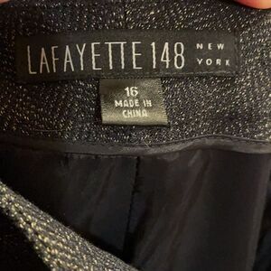 Lafayette 148 New York Black wool wide leg pants, size 16. Excellent used condition. Lined. Black with gold thread running throughout. 93% virgins wool, 7% polyester. 31” inseam