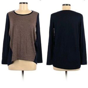 Two Toned Color Blocked Taupe and Navy Blue Scoop Neck Long Sleeve Tunic Baseball Jersey Style Wool Blend Top by Lafayette 148 New York .