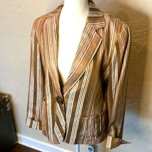 GORGEOUS blazer with gold metallic stripes throughout, in a size 6! It is so sharp, and will be statement piece for any chic wardrobe! There are very thin shoulder pads built in, just to give a bit of structure. It’s beautiful!