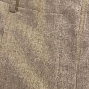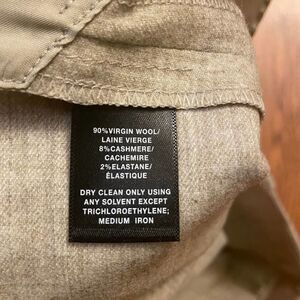 Tan khaki virgin wool cashmere blend wide leg dress pants. Front pockets. Belt loops. Zipper and double hook & bar closure. Interior button. Single pleat. Career wear.