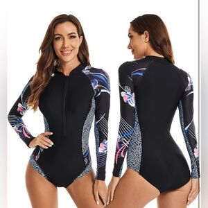 LafyKoly Women's One Piece Long Sleeve Rash Guard UV Protection Printed Surfing Swimsuit Swimwear Bathing