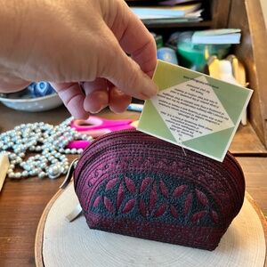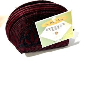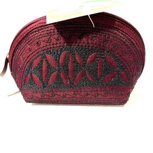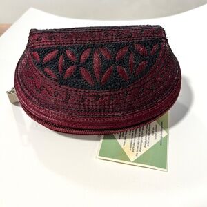 Laga Designs Handmade Tari Mini Dance Coin Purse. The case has a hard shell. The mini purse color is of a deep burgundy color with black embroidery. The interior is a black satin lining. This is a very detailed coin purse. The interior has the Laga tag inside .Top zipper for closure. 5" X 3 1/2"This is a vegan and animal-free tested bag is not just beautiful but also ethical. Great condition.