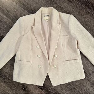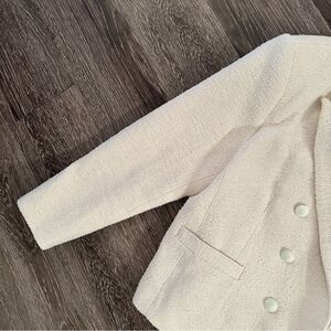 An essential open front blazer in a richly textured cotton in neutral ecru-white. Smartly tailored design features strong shoulders, sharp peaked lapels, and sleek welt pockets. Seaming details add subtle, feminine shape. Includes six tonal embossed-dome accent buttons as accents. Fully lined.