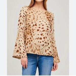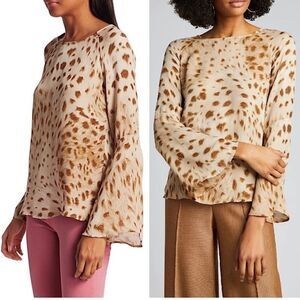 Spotted in cacao-hued cheetah, Dylan blouse is cut for a relaxed silhouette with bell sleeves in airy silk chiffon. Back keyhole button closure.