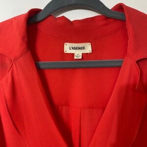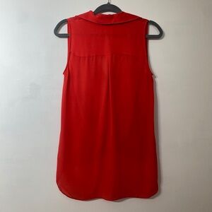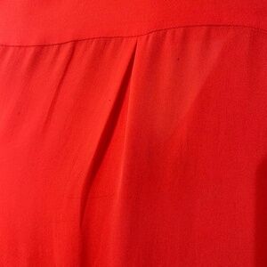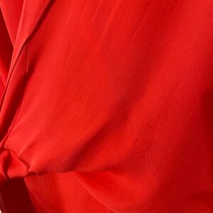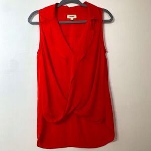 An red sleeveless blouse with a wrap-effect that drapes into a billowed hem in the front, and extends to a long curved hem in the back. A soft, fluttery collar adds graceful texture. Invisible front button closure, 100% Silk.Worn 3 times, there are small snags on the back and outside.