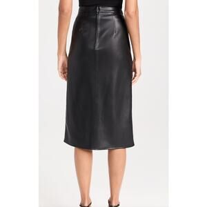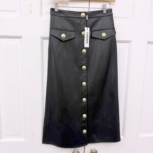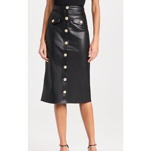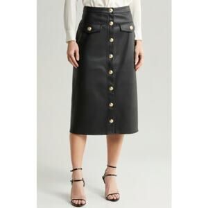 A sleek silhouette and luxe gold accent buttons define our Milann vegan leather skirt. The pencil skirt silhouette hugs the waist before draping straight to the midi hem. The embossed-dome button convert to functional snaps at the hem, letting you create a front-slit look. Wear with a minimalist top and pointed-toe boot to let the skirt take center stage.