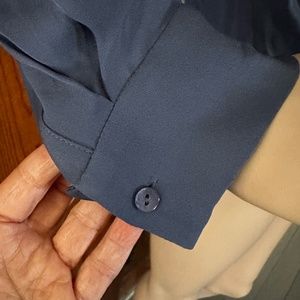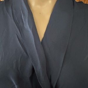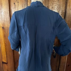 100% Silk elegant knotted waist blouse by L'Agence. Features modesty snap at neckline. Beautiful shade of light navy blue that is hard to photograph to show true color. This item is new with tags, I tried it on and think that it fits larger than most of my higher end blouses - so it is likely better suited for someone who is a size 6 vs 2-4. The fabric hangs nicely and is good quality.