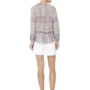 L’agence silk peasant top, Crawford Billow sleeve blouse, purple and white floral type pattern, full sleeves with buttoned cuff, split neck with drawstring, 100% silk, mixed pattern trim along the waistline, slightly longer in the back
