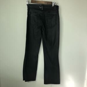 Kendra high rise crop flare noir coated raw hem jeans with slight shimmer