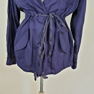 Utility cargo jacket by luxury designers at l'agence is meant to look perfectly worn in. Has gathers at elbow, elastic wrist, drawstring hem and waist. Gently loved condition. Silver metal snap closure. Great lightweight jacket. On trend for nautical/ military looks