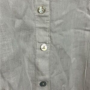 100% linen. Short dolman sleeves. Pearlescent button back detail (not functional buttons). Crew neck neckline. Longer tunic length.