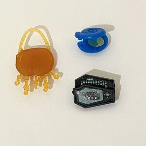 Includes Doll with complete outfit, purse, phone, seashell, brush, trading card, and doll stand