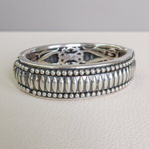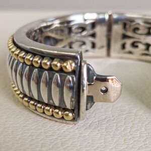 Solid, beautifully made bangle from the Lagos Caviar collection. Sterling silver with rows of 18K yellow gold beads along the edges. The interior shows the signature openwork pattern and secure clasp. Feels substantial and comfortable on the wrist.