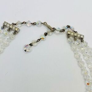 Beautiful 60s LAGUNA signed three strand Austrian Aurora Borealis Crystal clear necklace. The necklace features three strands of the sparkly changing colors beautiful crystals as light hits from different directions. The necklace has an adjustable crystal chain extensions on both sides.