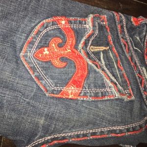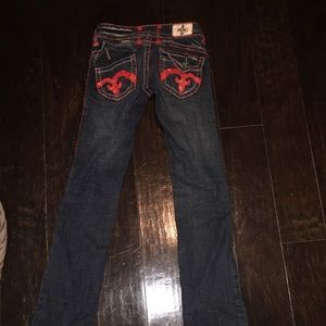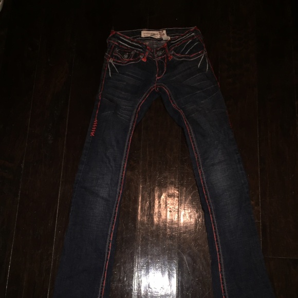 Red stitching super cute fit more like a 24-25. Seriously super cute. Has a few flaws. One button is missing on the butt and the design is coming off on the butt pockets i still wore them and I still got so many compliments. Non-Smoking house hold. Feel free to make offers! Or bundle :)