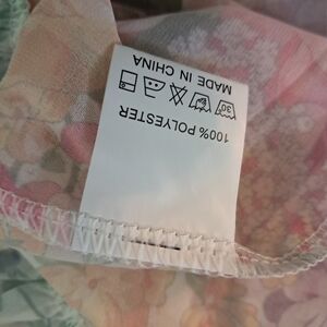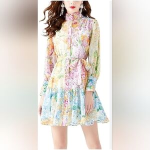 Featuring a dreamy pastel floral print in shades of pink, yellow, green, and blue, this dress is a romantic blend of elegance and charm.
