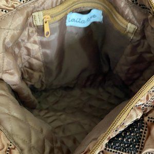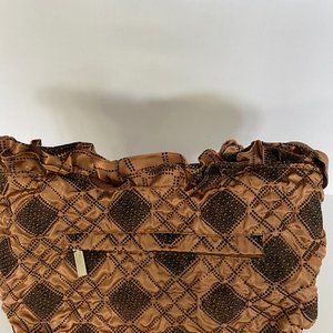 Laila Rowe cosmetic toiletry bag, top Zipper closure, interior compartment with 1 side zippered, Double stretchy handles, detailed stitching, brown and shinny bronze satin feel of a great practical bag for many uses.