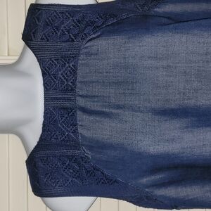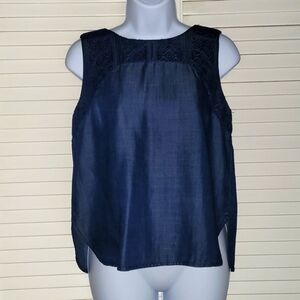 Laju Womens Chambray Top Size S Tencel Embroidered Sleeveless Crew Neck Pullover. Pre-owned and gently worn! Chambray fabric with a pretty embroidered detail on the front. No rips, stains, etc. Back hangs a little lower than the front. Keyhole opening in the back with hidden button closure.