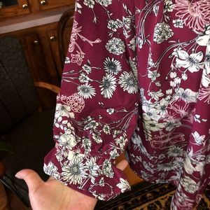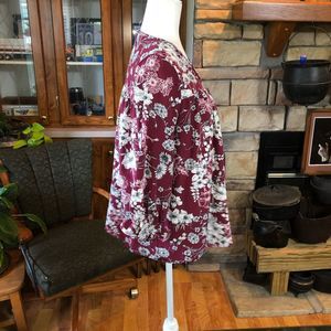 Lake flower size Medium floral wine colored v/neck 3/4 sleeve with elastic at cuff to ruffle