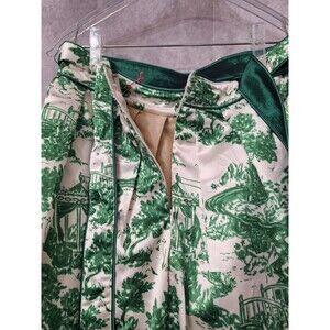 The Lake Lady Graphic Print Belted Circle Skirt in size small is a stylish and versatile piece perfect for various occasions such as weddings, parties, formal events, workwear, holiday parties, Christmas, Kentucky Derbies, and business meetings. The skirt features pockets and a back zipper and a geometric pattern in green and cream colors with a high-rise, A-line style. Made from polyester and spandex with a satin fabric type, it includes pleated and layered accents, a zipper closure, and pockets for added functionality. Ideal for all seasons and suitable for a variety of themes, this skirt is both lightweight and lined for comfort. Perfect for the fashion-forward woman looking for a chic and trendy piece to add to her wardrobe. Waist 15 in. length 30 in.