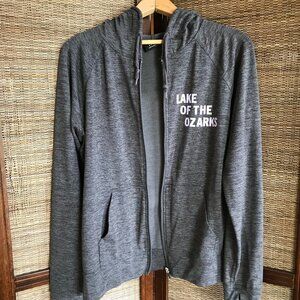 Lake hoodie, size medium (8-10), with Lake of the Ozarks graphics containing names of various marinas and landmarks. This is a recycled zippered lightweight charcoal gray hoodie to which LOZ graphics have been applied in pink and pale violet. This jacket would make a great unique gift for any LOZ enthusiast!