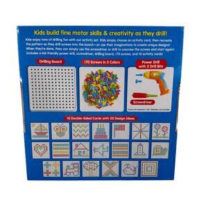 Lakeshore Learning "Create & Design Drill Kit" includes a power drill with 2 drill bits, 170 colorful screws, a screwdriver, 10 double-sided activity cards, and a durable drilling board. Great for building fine motor skills, pattern recognition, and creativity. Ideal for ages 3 and up. Power drill requires 2 AA batteries (not included). Box is sealed and unopened.