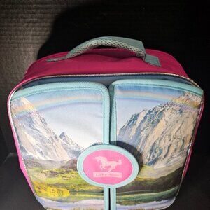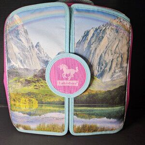 Let your child's imagination run wild with this lake shore fantasy adventure backpack. The playset features a fold out scene with Unicorns and Pegasus perfect for hours of imaginative play. The backpack is designed as a playset, making it easy to bring along on trips and play dates. This play set backpack is made by Lakeshore, a trusted brand in educational toys. The backpack is designed for girls and is in a beautiful pink color. It was manufactured in China in 2013 and features a fantasy theme with a unicorn subject. The backpack is perfect for young children who love to play and explore their imaginations. The backpack is pre owned and in very nice clean and free of tears, rips, stains, Etc. It did not have any unicorn figures. There are six new ones that I purchased included in the playset. They are not original to the backpack. Backpack measures 12 inches by 12 inches by 5 inches. When you open the front, velcro, Lakeshore Circle tab, it opens the fantasy Play Mountain Lake scene that measures 23 inches long by 17 inches wide. Non smoking pet free home.