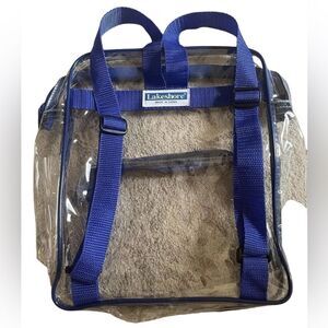 This clear backpack from Lakeshore is a perfect choice for those who need a versatile and stylish bag. It has a front pocket for quick access to your belongings and adjustable straps for a comfortable fit. The bag is made of PVC material with blue nylon straps and plastic hardware.